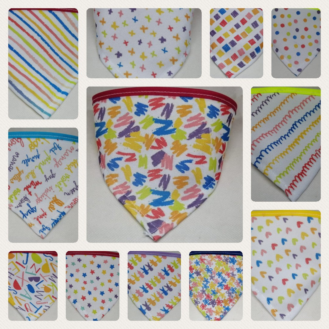 El triangulo mini los catetos miden 10 cm y el largo incluyendo el bies para el amarre es de 35 cm, el chico 15 cm x 42 cm, el mediano 20 cm x 52 cm y el grande 25 cm x 60 cm aproximadamente