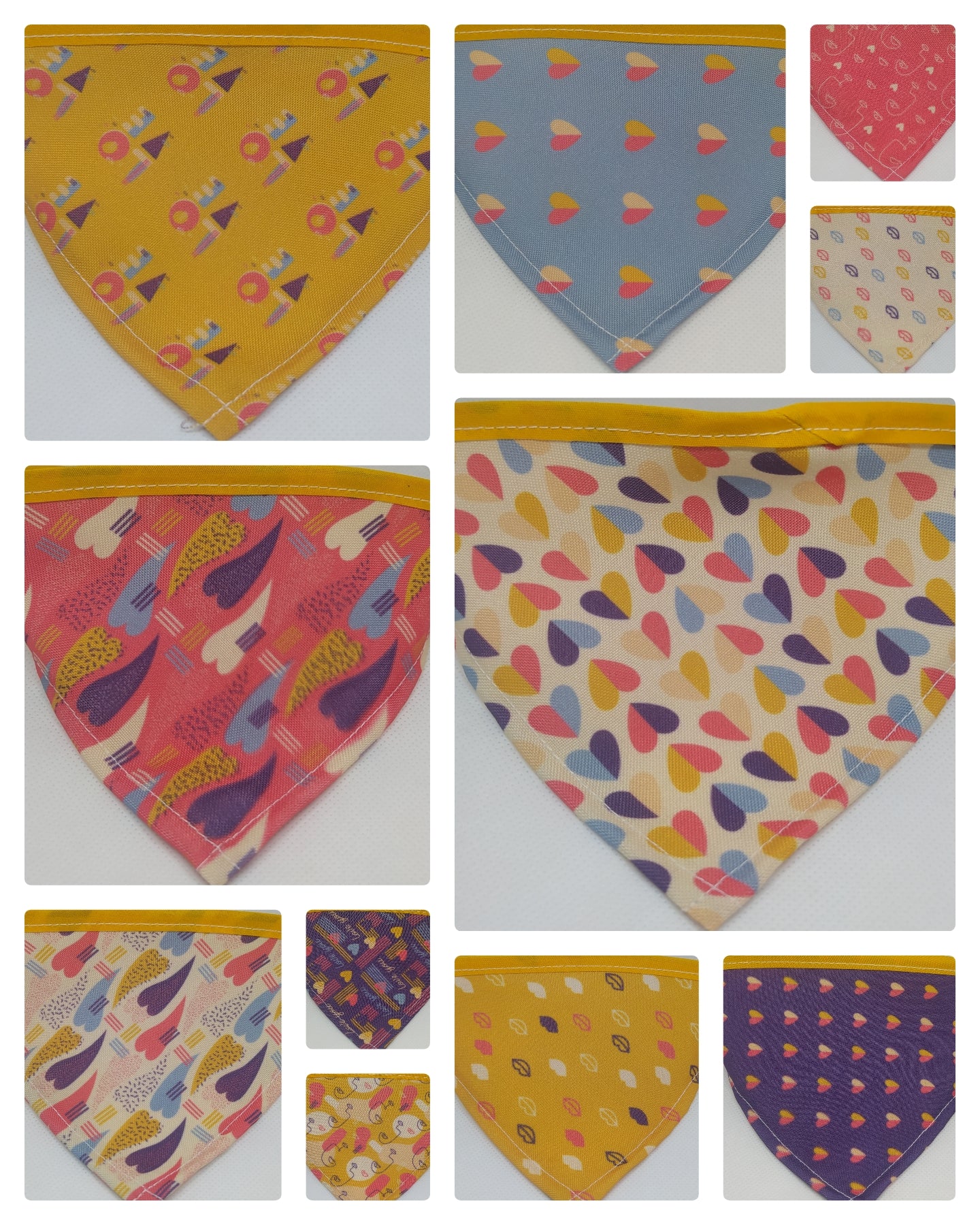 El triangulo mini los catetos miden 10 cm y el largo incluyendo el bies para el amarre es de 35 cm, el chico 15 cm x 42 cm, el mediano 20 cm x 52 cm y el grande 25 cm x 60 cm aproximadamente