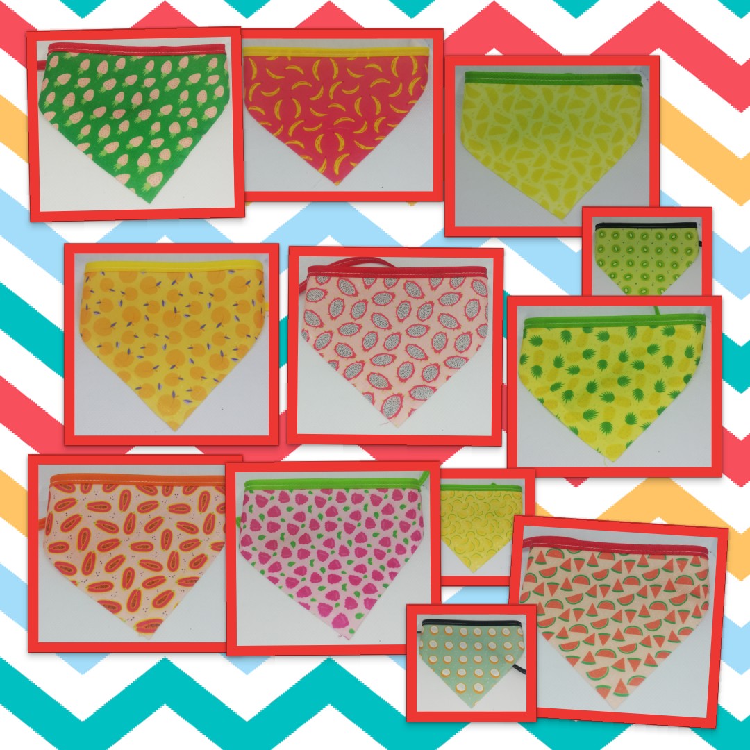 El triangulo mini los catetos miden 10 cm y el largo incluyendo el bies para el amarre es de 35 cm, el chico 15 cm x 42 cm, el mediano 20 cm x 52 cm y el grande 25 cm x 60 cm aproximadamente