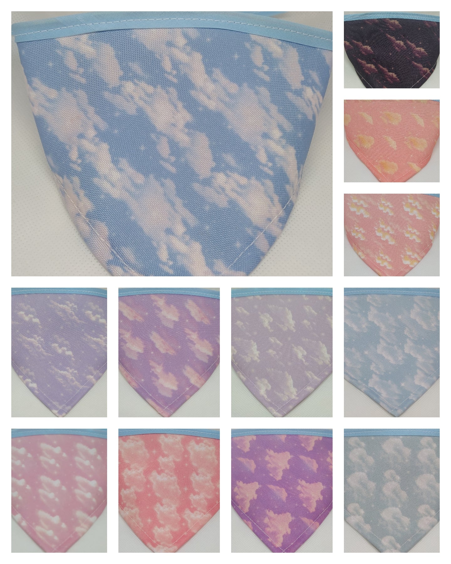 El triangulo mini los catetos miden 10 cm y el largo incluyendo el bies para el amarre es de 35 cm, el chico 15 cm x 42 cm, el mediano 20 cm x 52 cm y el grande 25 cm x 60 cm aproximadamente