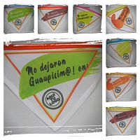 El triangulo mini los catetos miden 10 cm y el largo incluyendo el bies para el amarre es de 35 cm, el chico 15 cm x 42 cm, el mediano 20 cm x 52 cm y el grande 25 cm x 60 cm aproximadamen