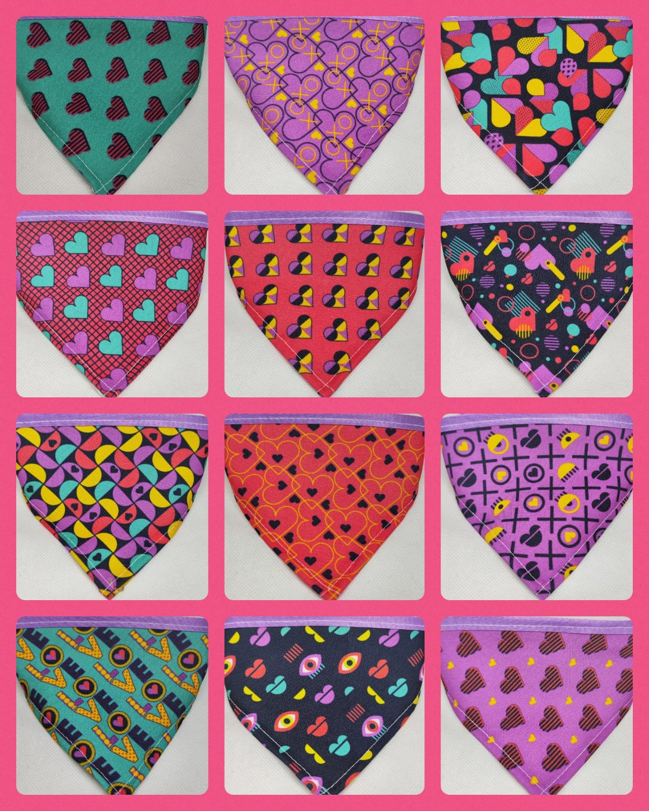 El triangulo mini los catetos miden 10 cm y el largo incluyendo el bies para el amarre es de 35 cm, el chico 15 cm x 42 cm, el mediano 20 cm x 52 cm y el grande 25 cm x 60 cm aproximadamente