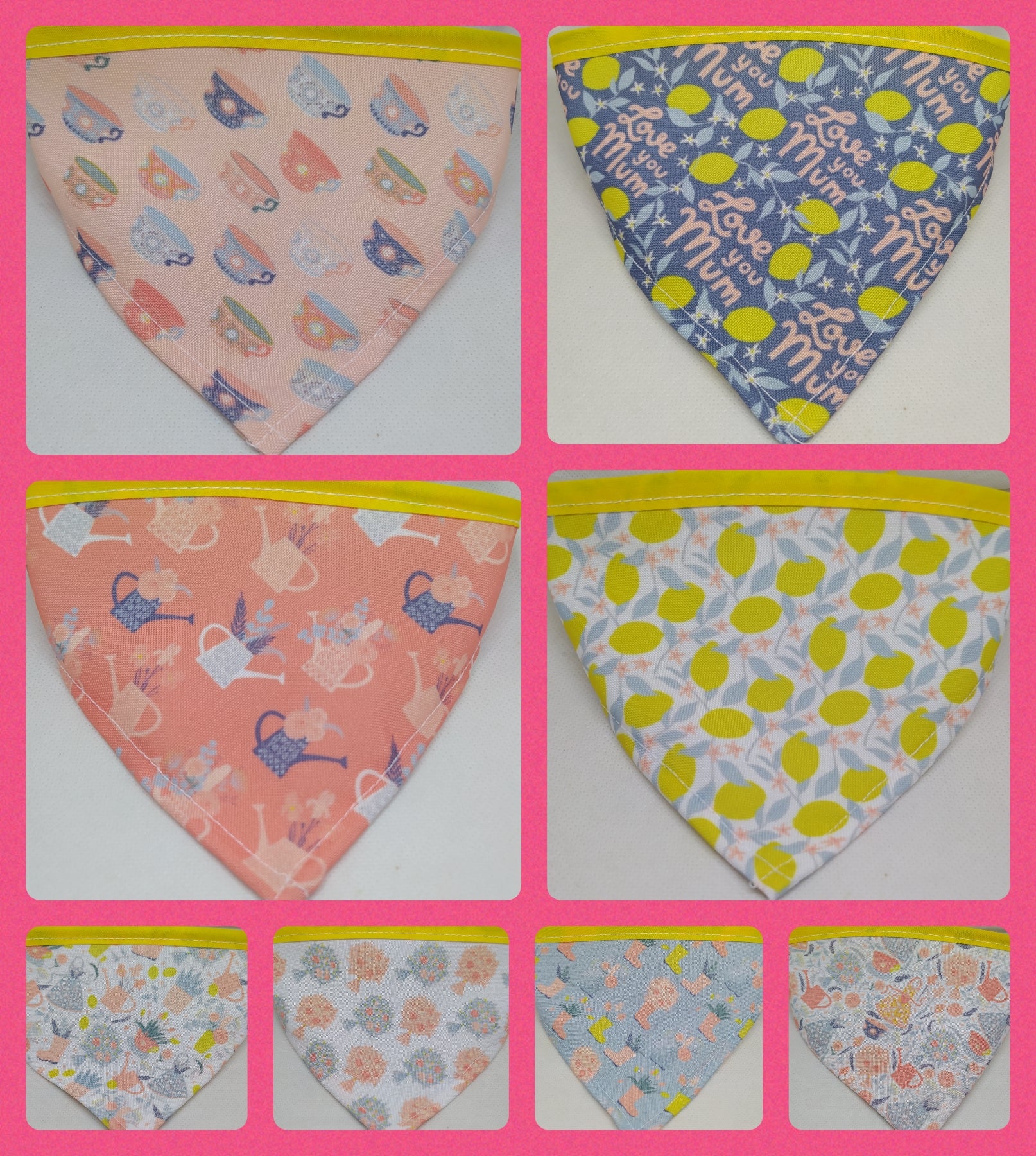 El triangulo mini los catetos miden 10 cm y el largo incluyendo el bies para el amarre es de 35 cm, el chico 15 cm x 42 cm, el mediano 20 cm x 52 cm y el grande 25 cm x 60 cm aproximadamente