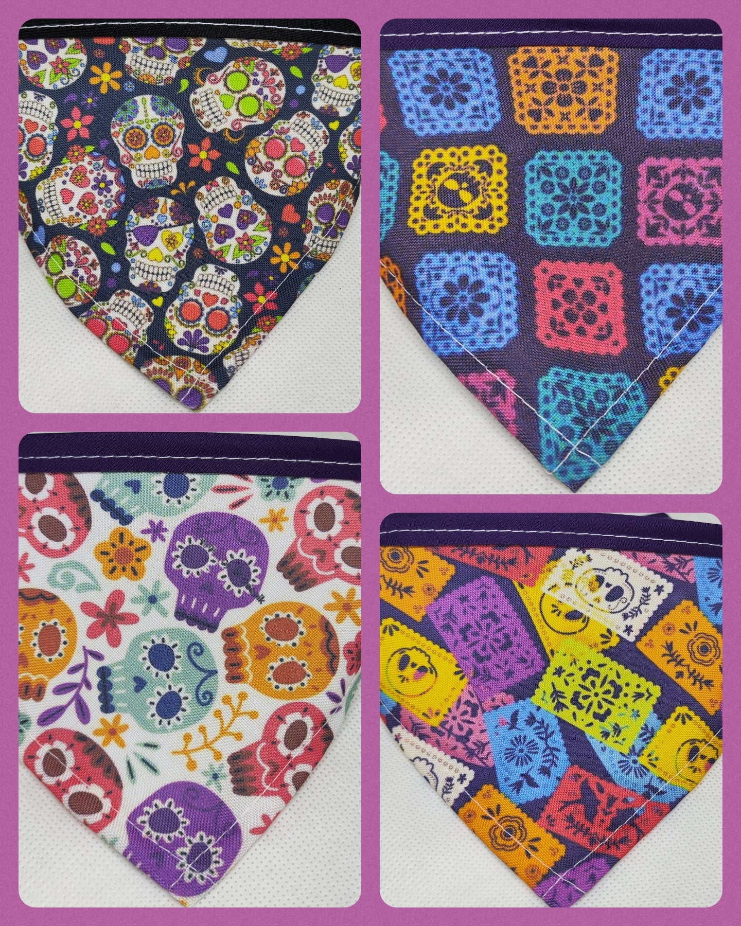 El triangulo mini los catetos miden 10 cm y el largo incluyendo el bies para el amarre es de 35 cm, el chico 15 cm x 42 cm, el mediano 20 cm x 52 cm y el grande 25 cm x 60 cm aproximadamente