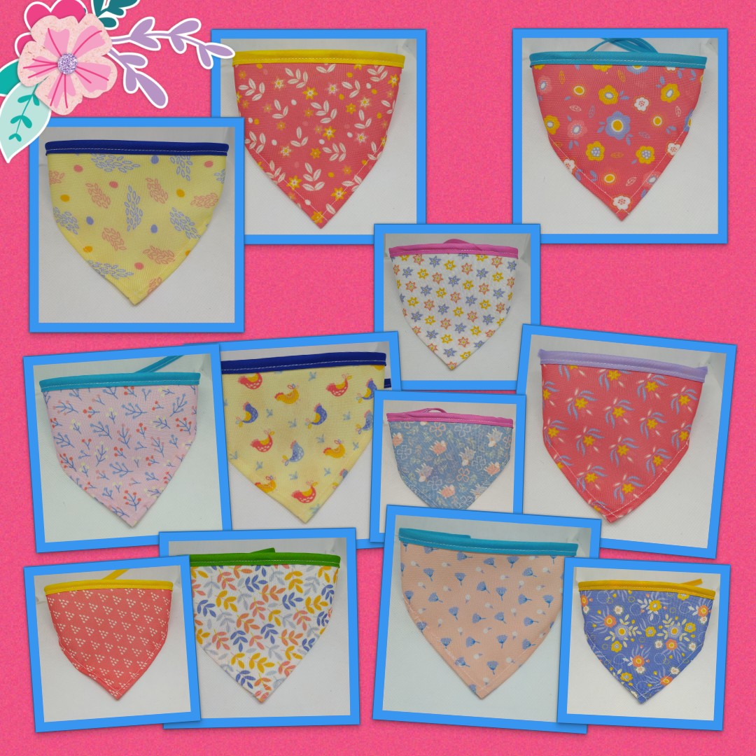 El triangulo mini los catetos miden 10 cm y el largo incluyendo el bies para el amarre es de 35 cm, el chico 15 cm x 42 cm, el mediano 20 cm x 52 cm y el grande 25 cm x 60 cm aproximadamente