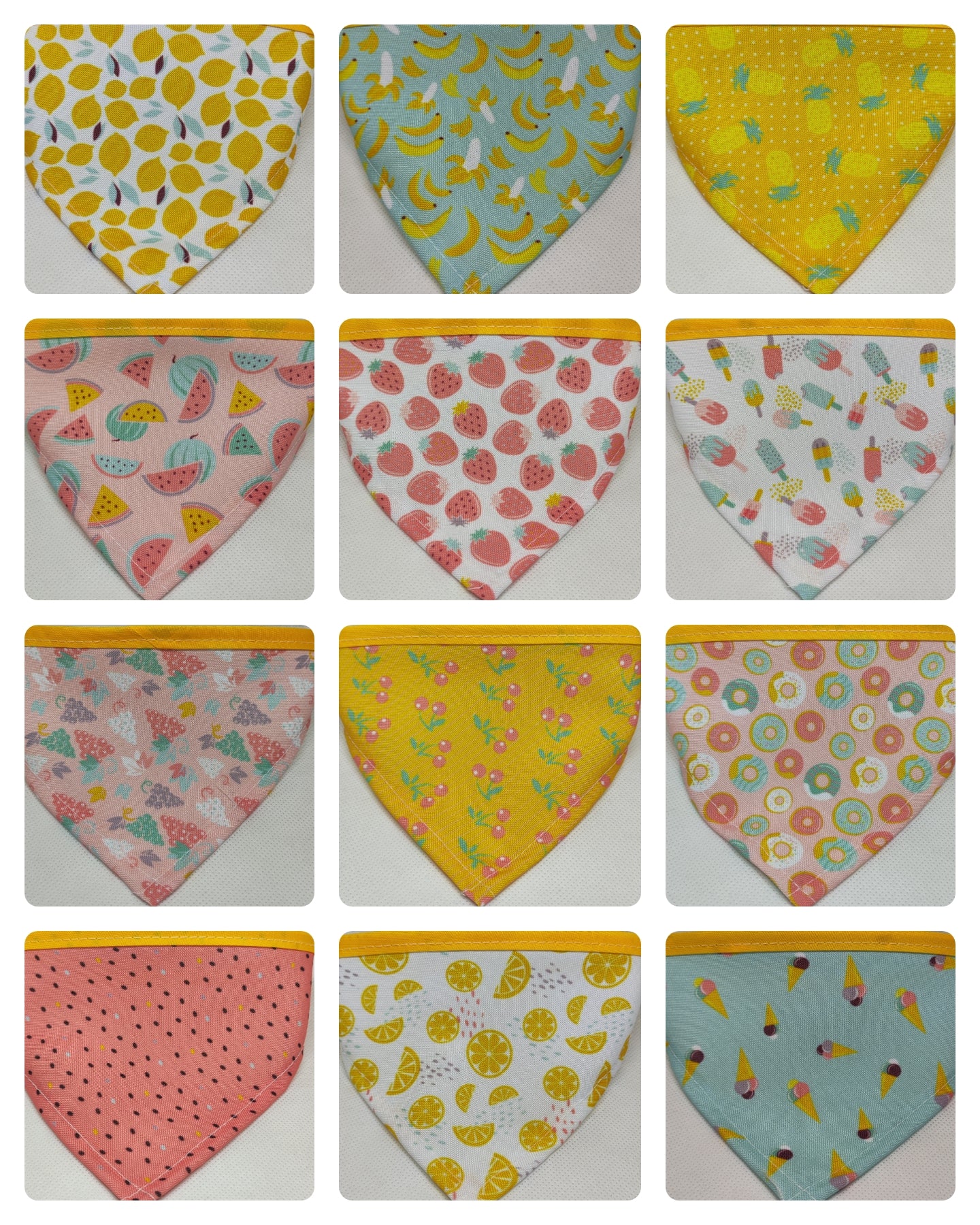 El triangulo mini los catetos miden 10 cm y el largo incluyendo el bies para el amarre es de 35 cm, el chico 15 cm x 42 cm, el mediano 20 cm x 52 cm y el grande 25 cm x 60 cm aproximadamente