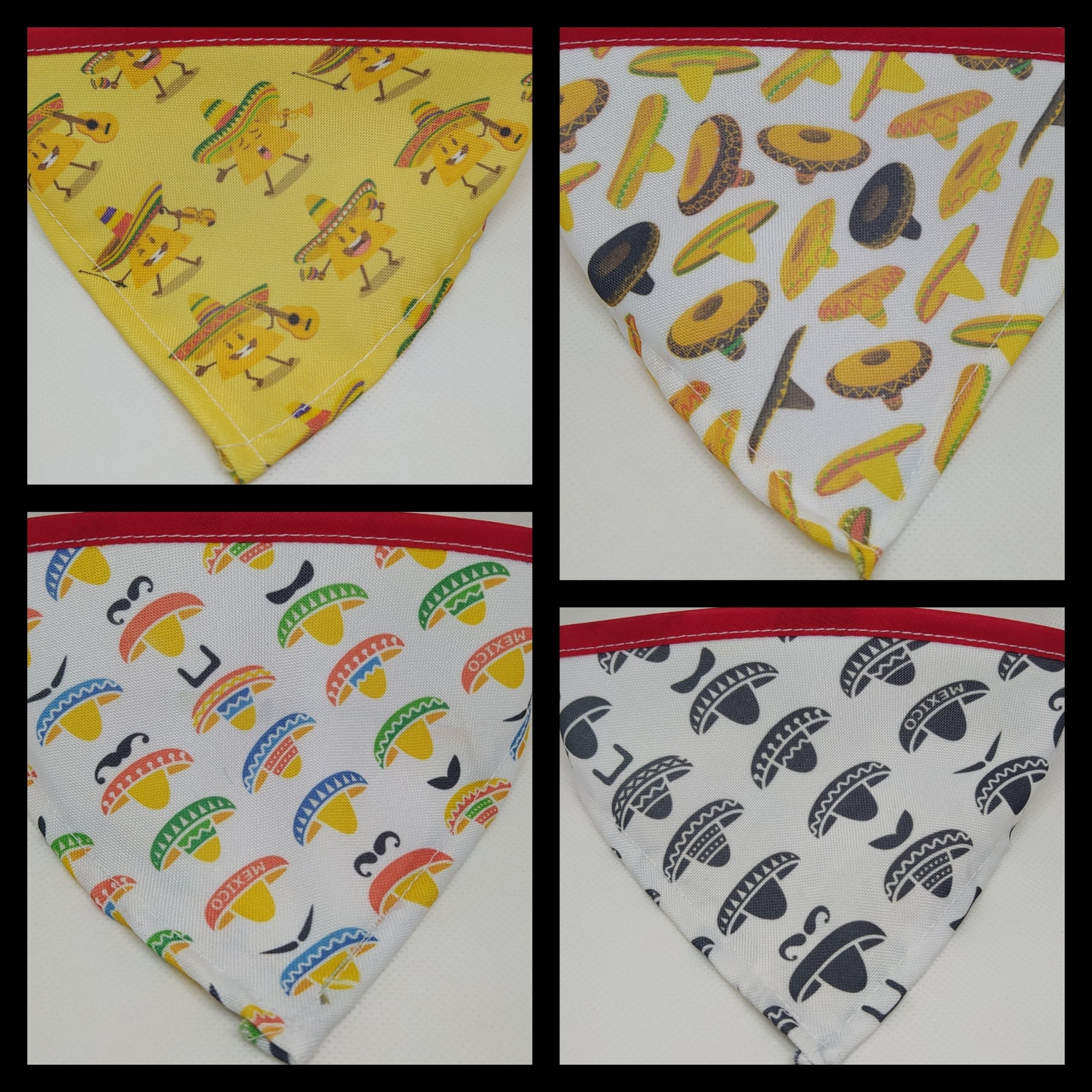 El triangulo mini los catetos miden 10 cm y el largo incluyendo el bies para el amarre es de 35 cm, el chico 15 cm x 42 cm, el mediano 20 cm x 52 cm y el grande 25 cm x 60 cm aproximadamente