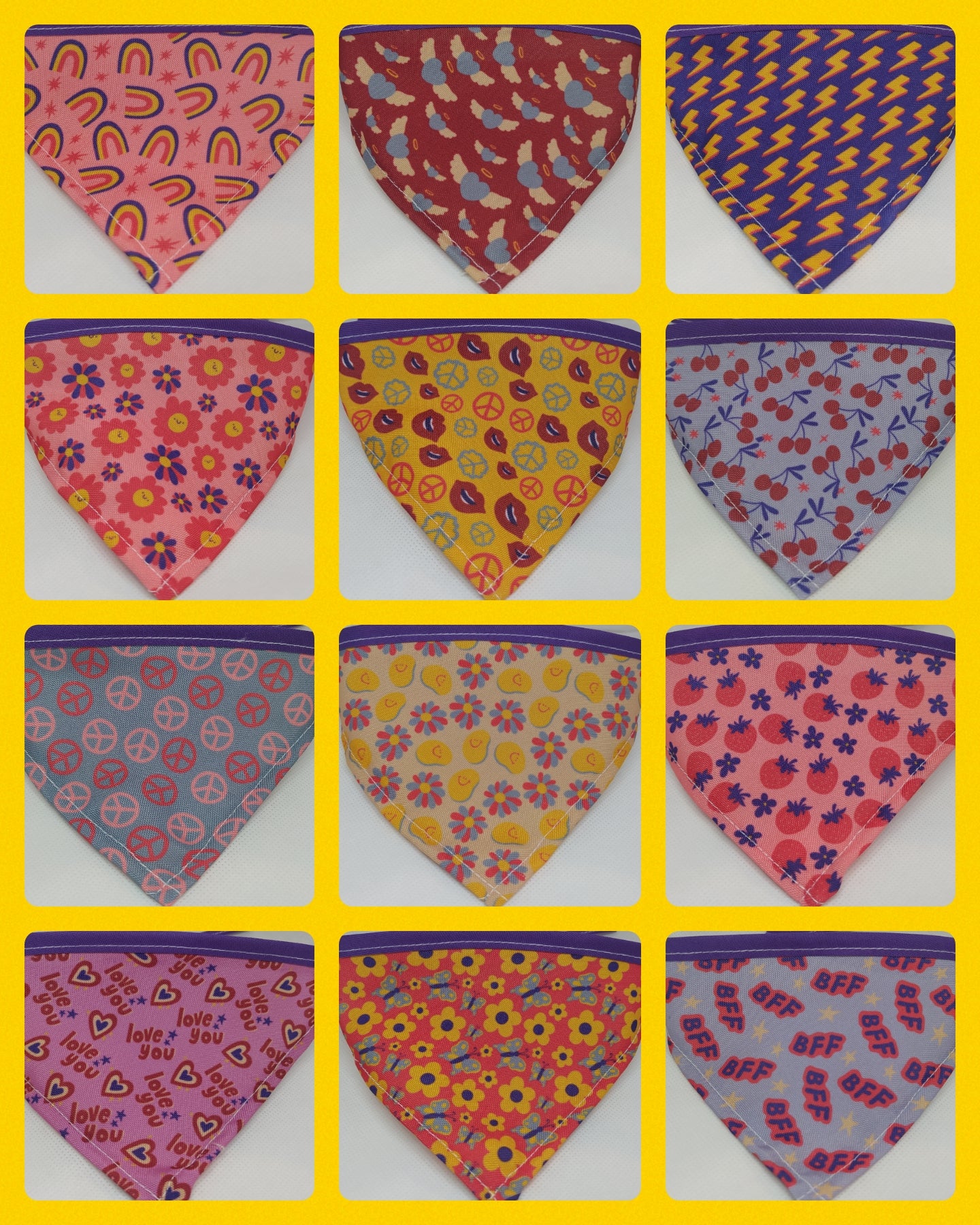 El triangulo mini los catetos miden 10 cm y el largo incluyendo el bies para el amarre es de 35 cm, el chico 15 cm x 42 cm, el mediano 20 cm x 52 cm y el grande 25 cm x 60 cm aproximadamente